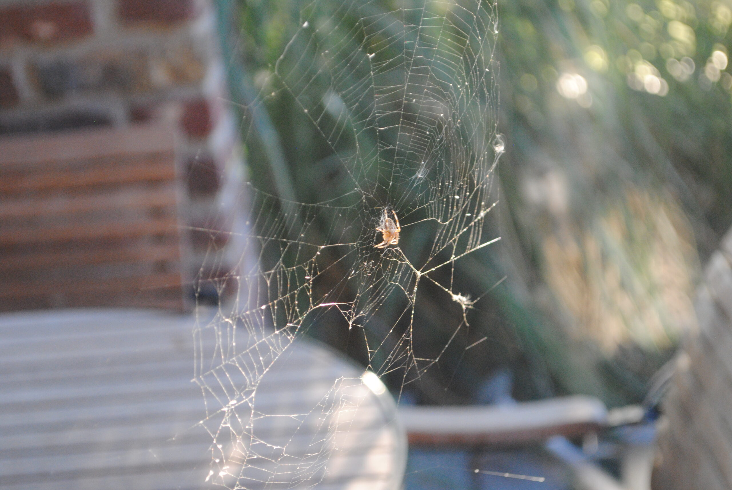 Im milden Schein leuchtet etwas auf unserer Terrasse  – ein Spinnennetz.