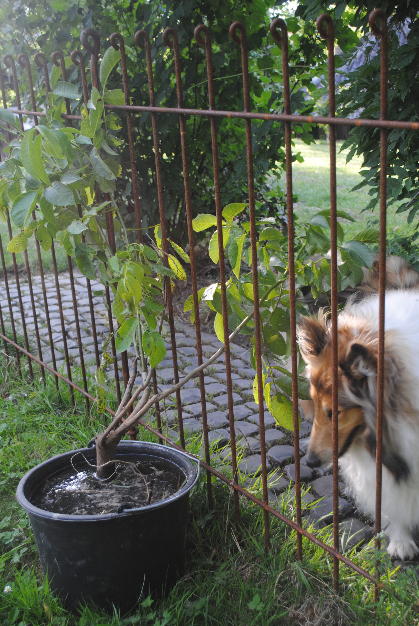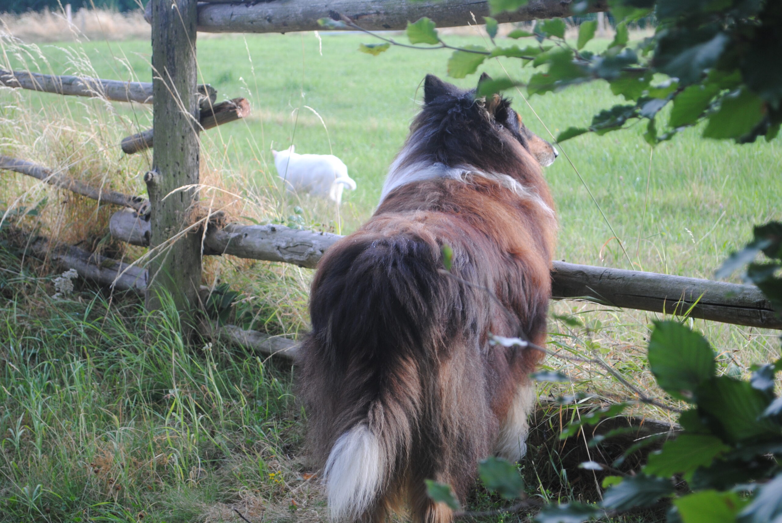 Da steht er nun, auf unserem Grundstück, an einen Zaun gelehnt, von Betti beschnüffelt.