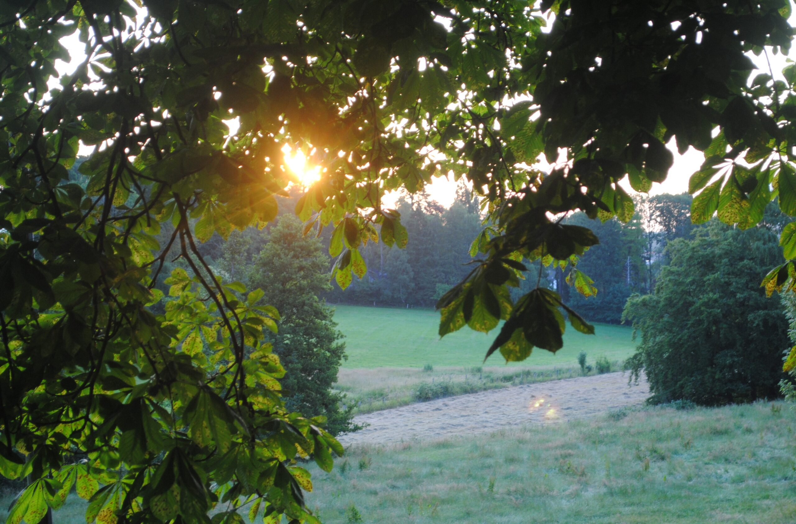 Die Morgensonne lugt durch unsere Kastanienzweige, gelbleuchtend.