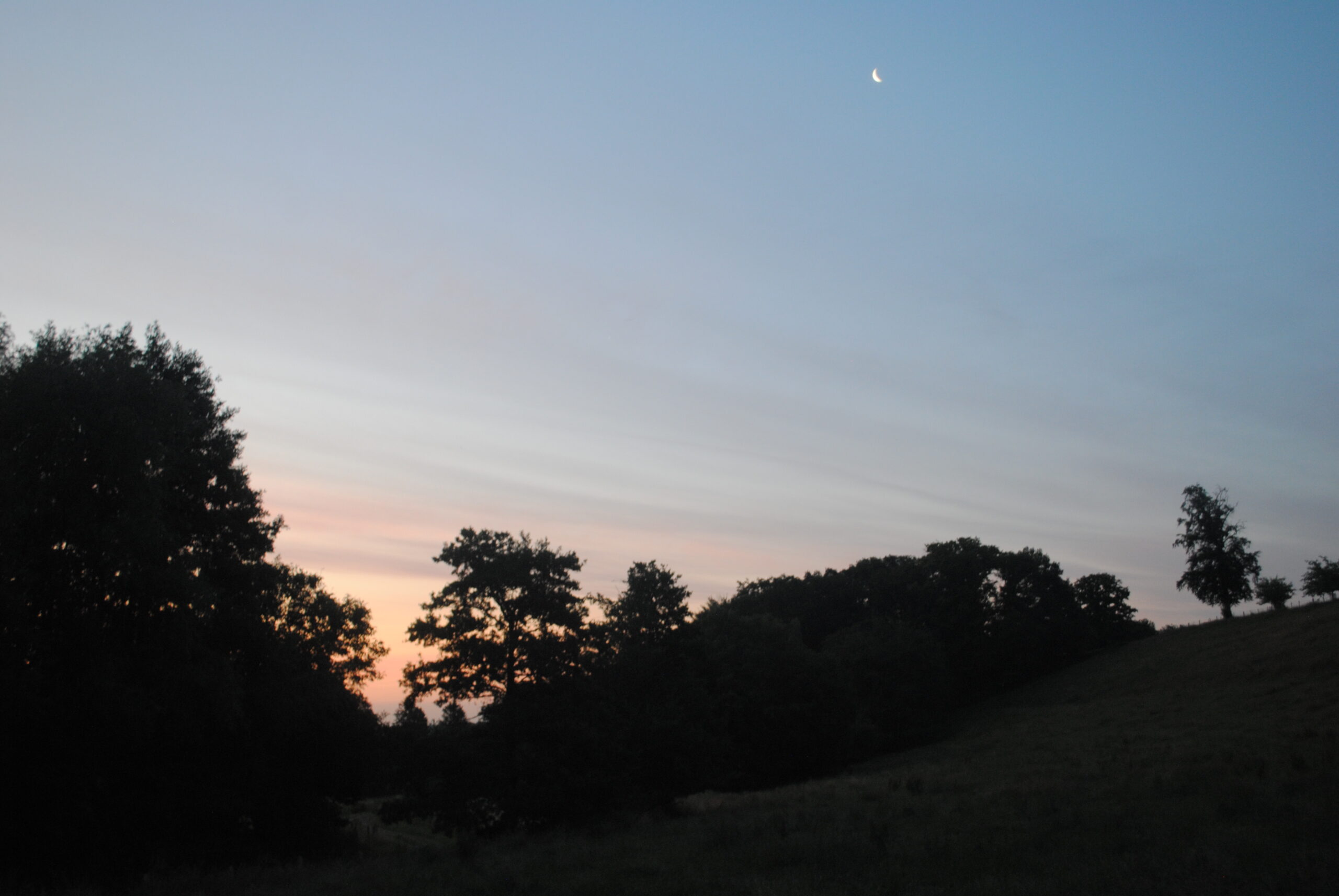 Der blasse feine Mond steht wie ein Federstreich am zartblauen Himmel.