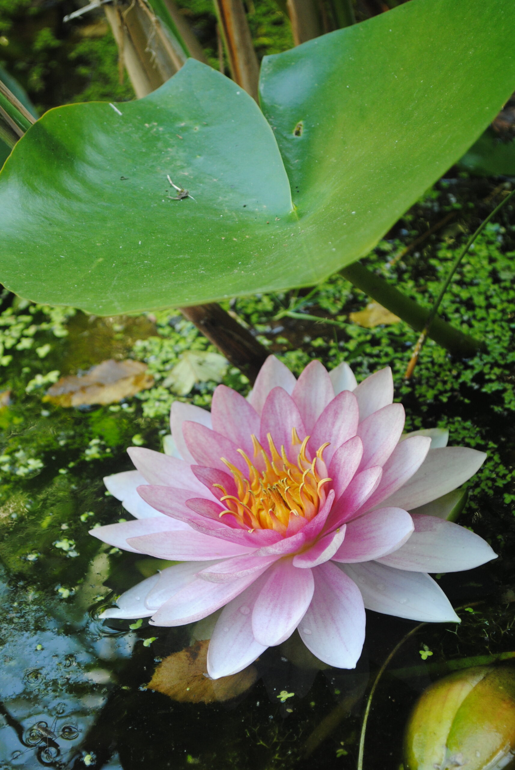 Über ihr ein einzelnes Blatt, wie ein Sonnenschirm platziert.
