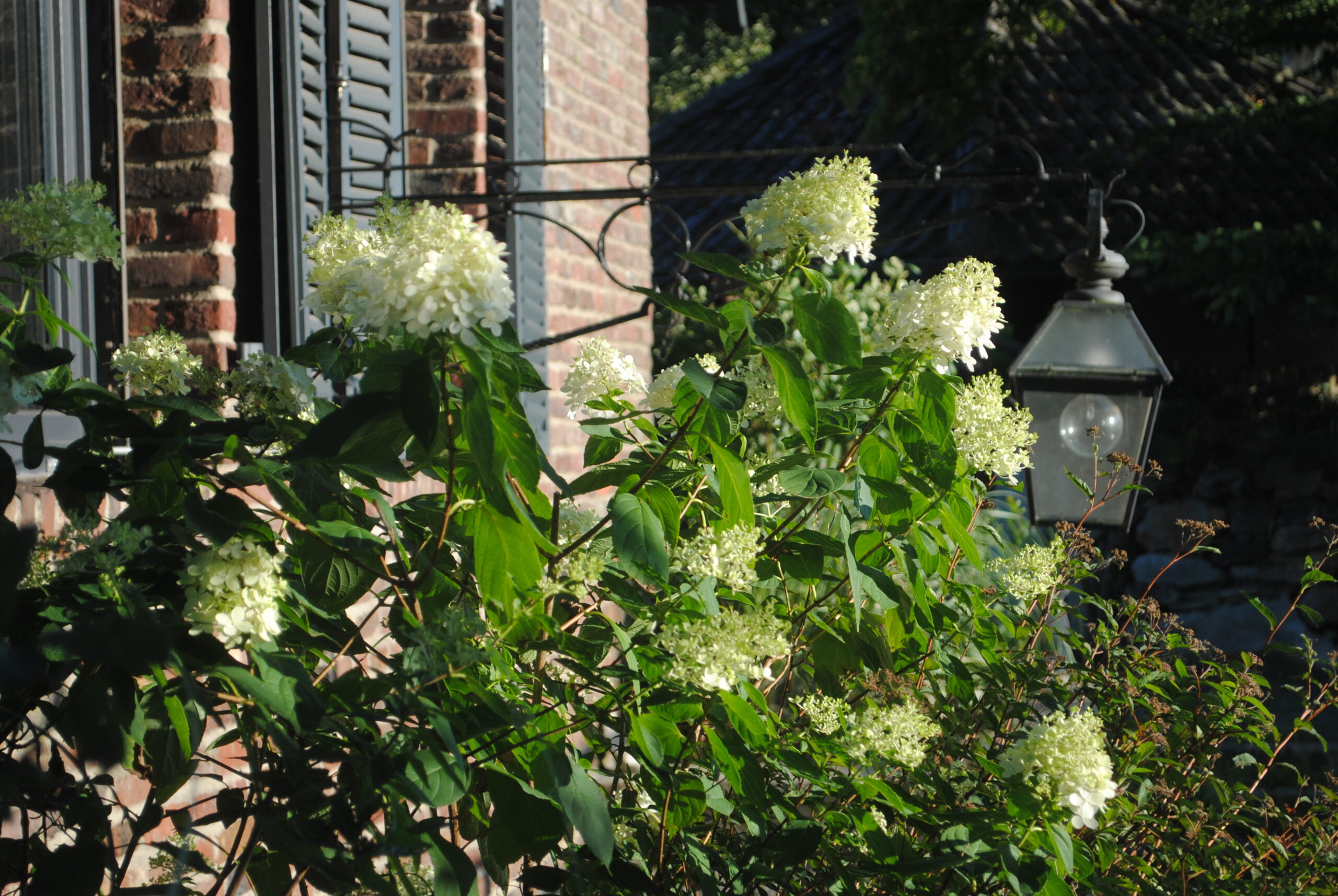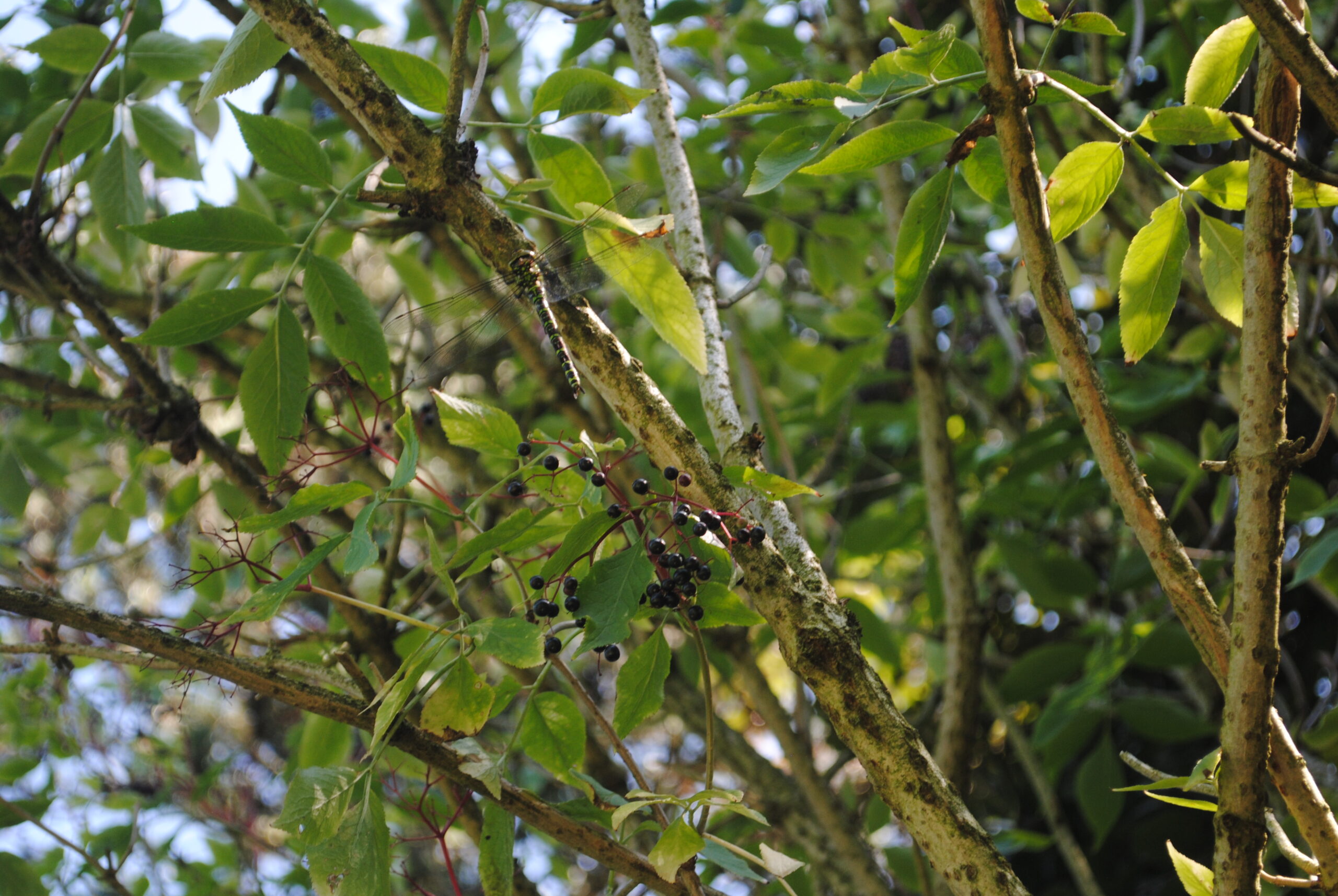 Eine kleinere verharrt in der Luft, fliegt den Holunder an, jetzt langsamer.