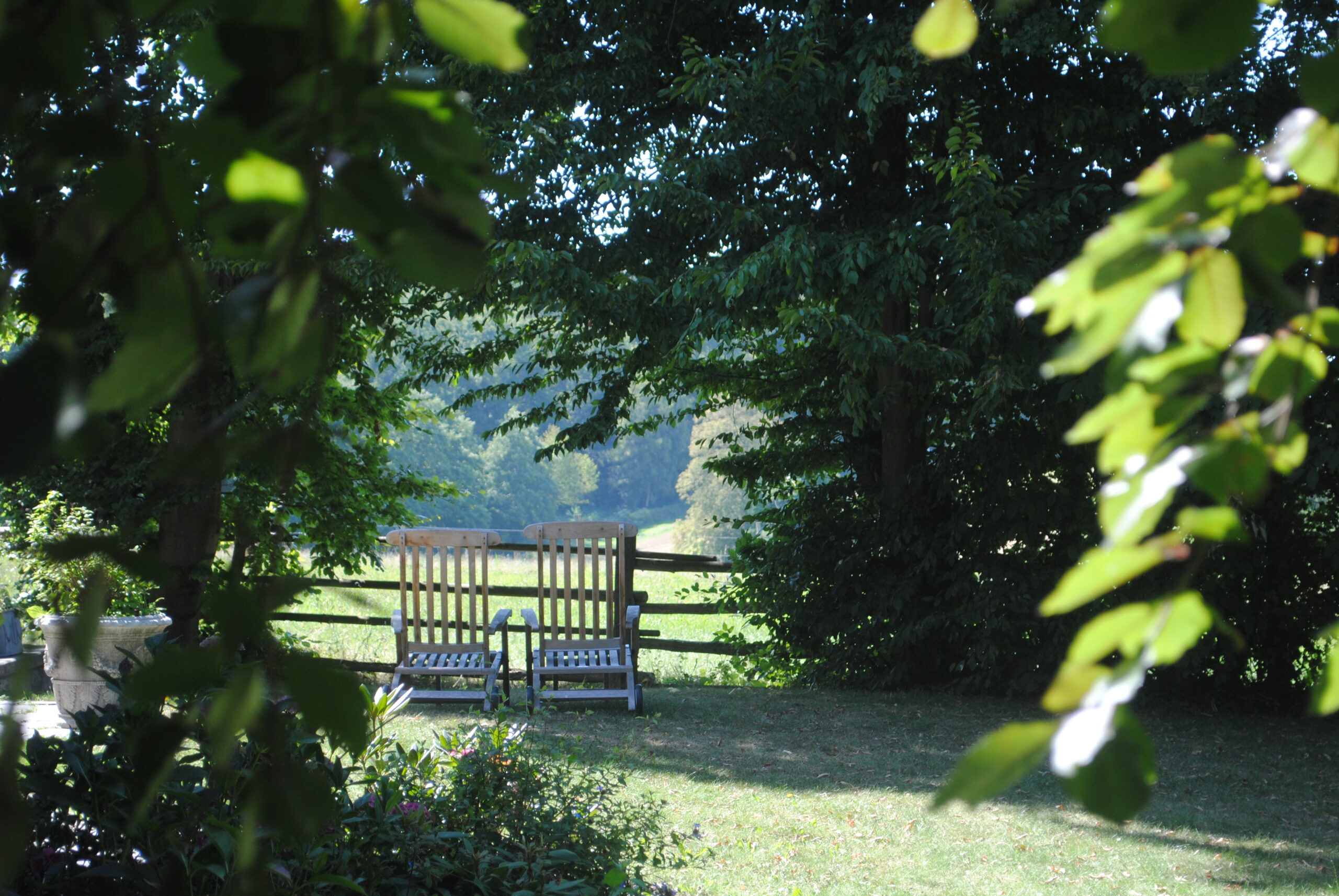 Sich auf einen Liegestuhl am Zaun niederlassen, mit Blick in die sommerliche Weite.