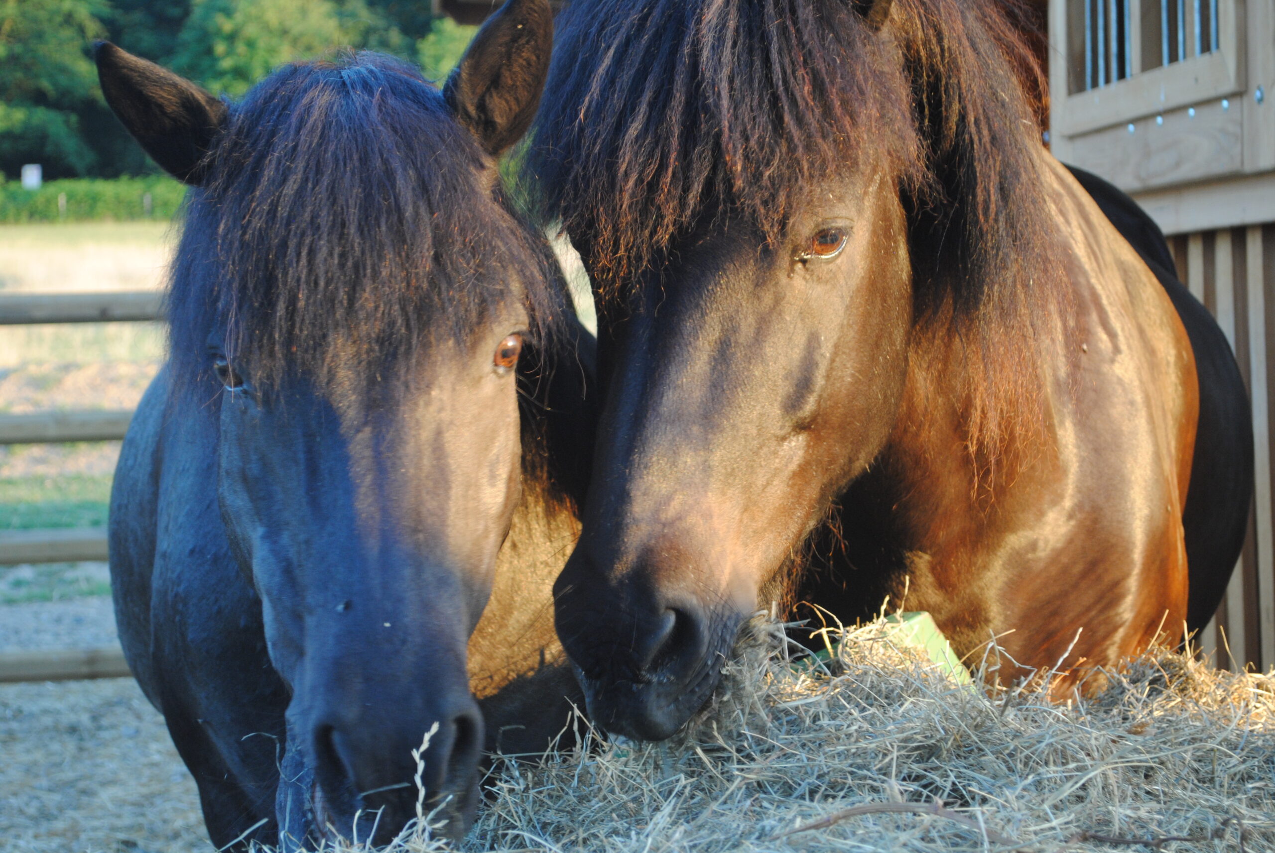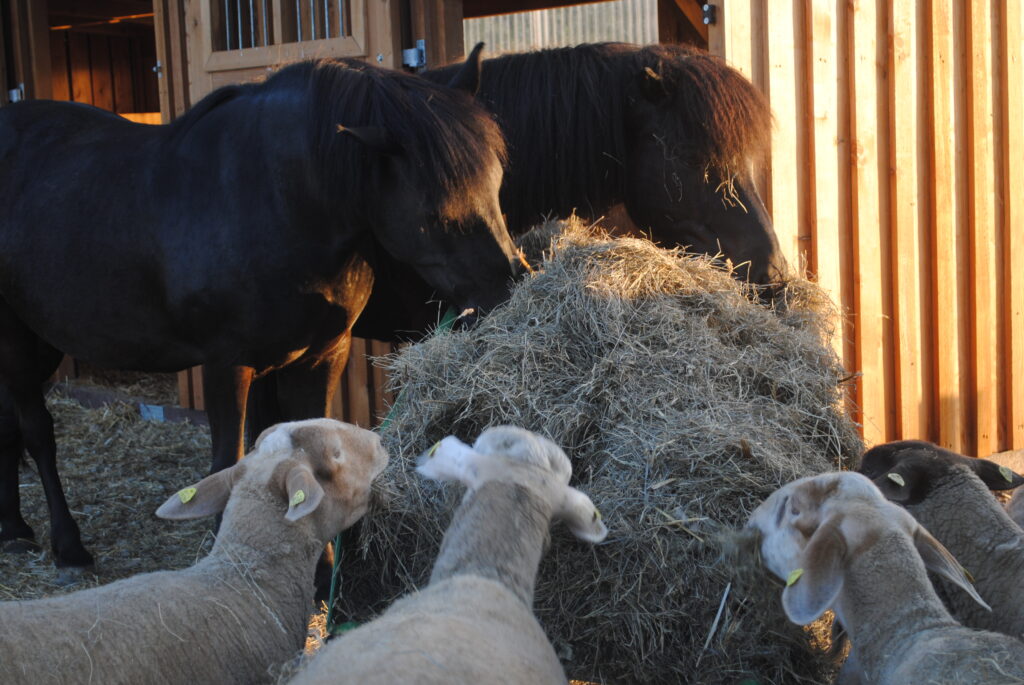 Die Schafe und Ponys halten sich vorzugsweise im kühlen Stall auf.