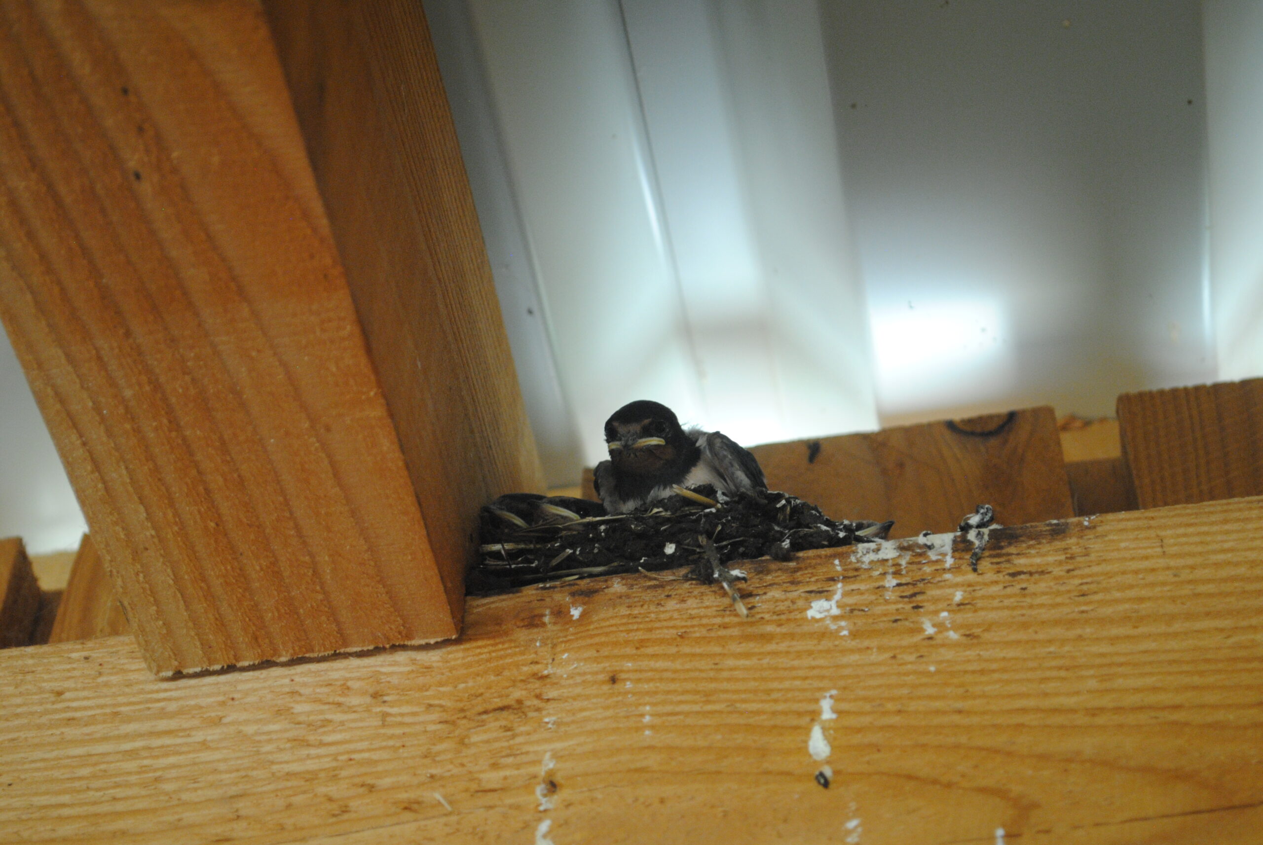 Gleichzeitig kann ich auf das Schwalbennest schauen, oben auf dem Balken gebaut.