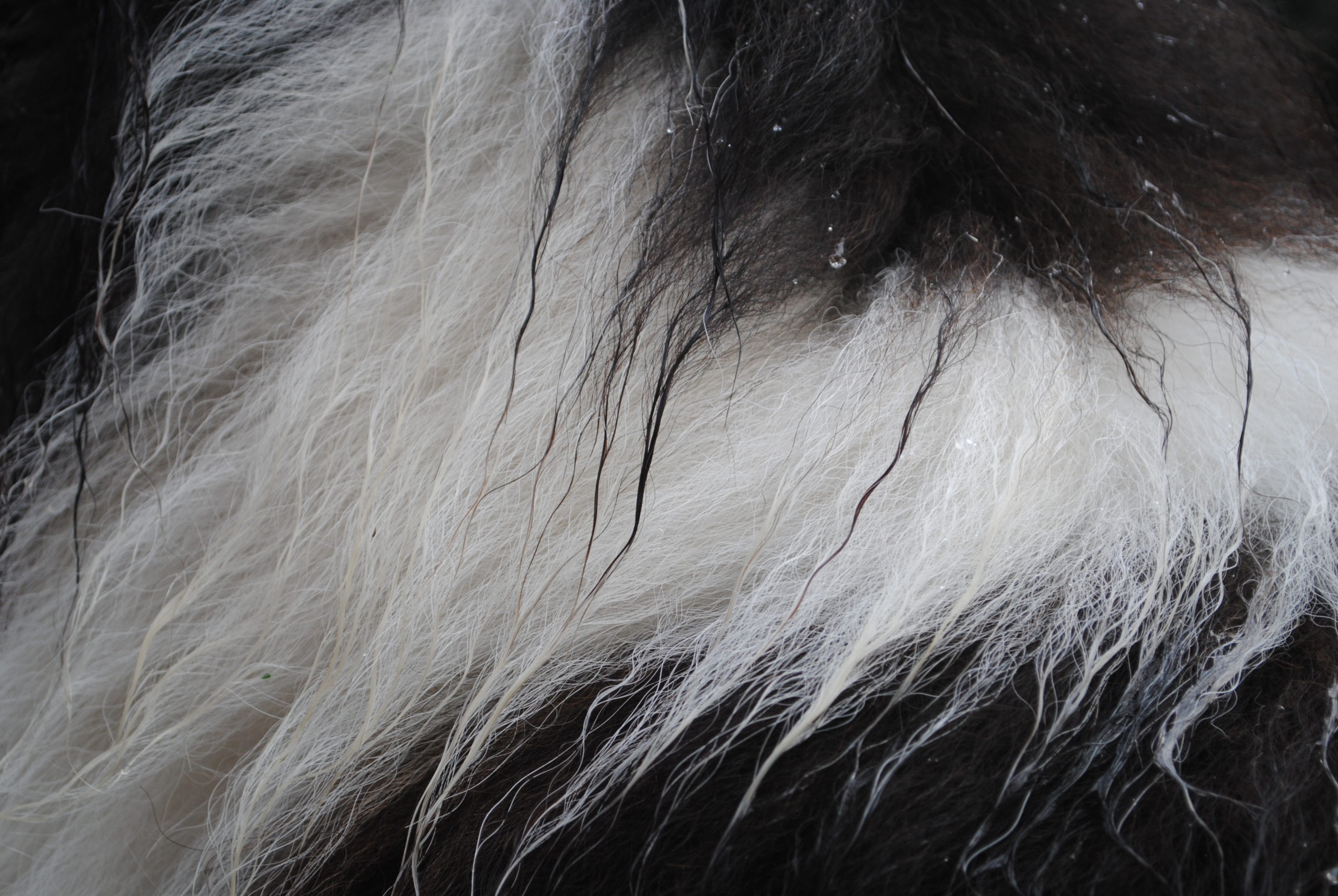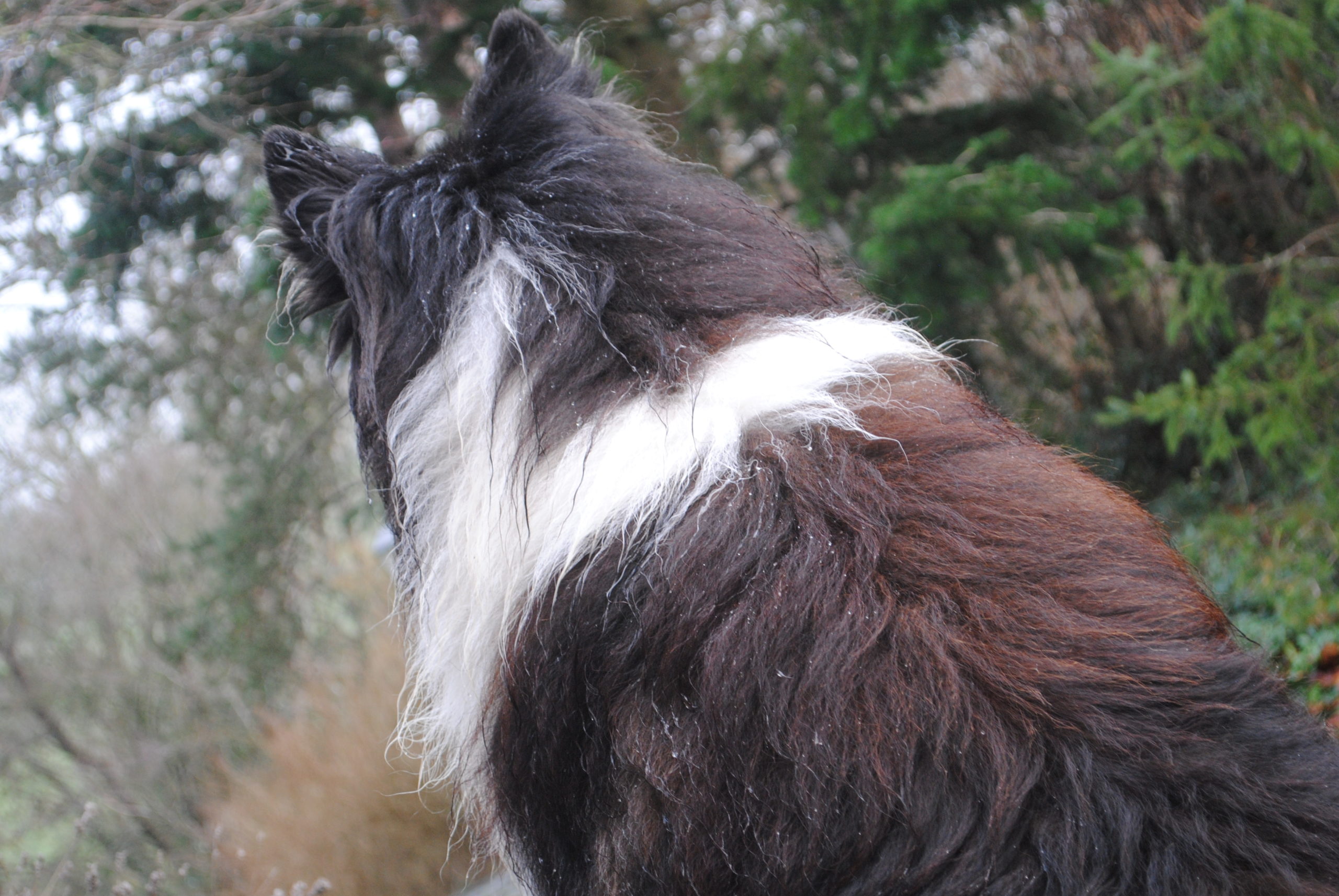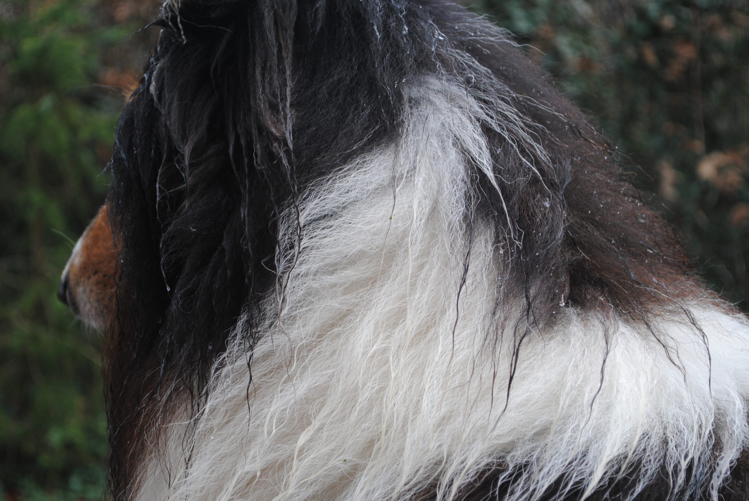 Als er zurückkommt, perlt der Regen an seinem dichten Fell, und um ihn herum steigt der Hauch seines warmen Atems auf.