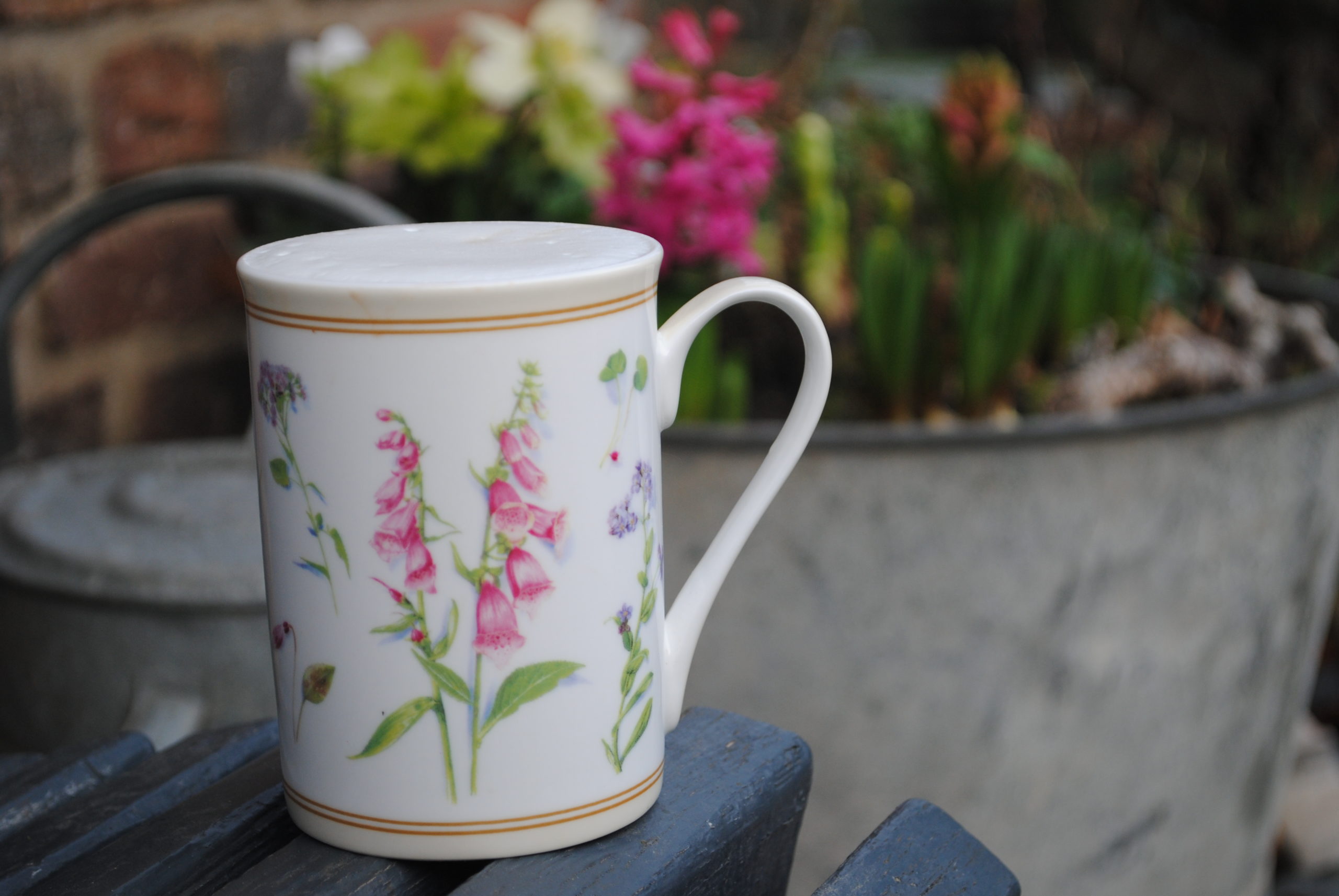 Ich liebe diese kleinen Blumen-Arrangements, jahreszeitlich passend, die ich immer gut sehen kann, wenn ich nach Hause komme oder auf der Bank nebenan sitze und meinen Kaffee genieße.