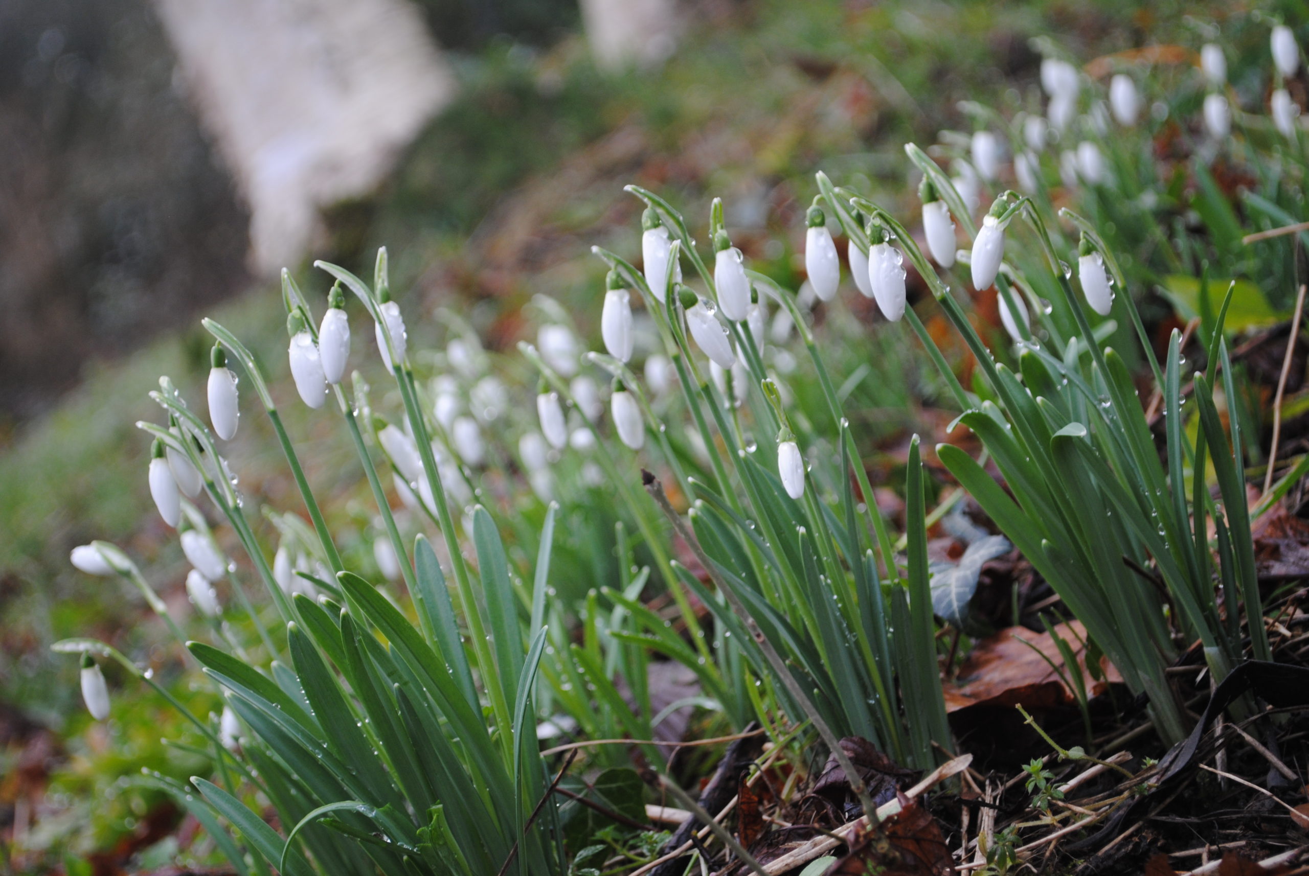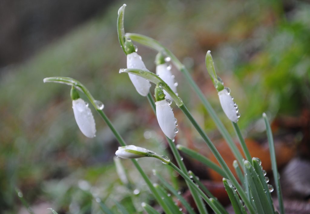 Ein Büschel Schneeglöckchen, am Fuße der Birken, ihre Blüten so weich und hell mit der Baumrinde korrespondierend.