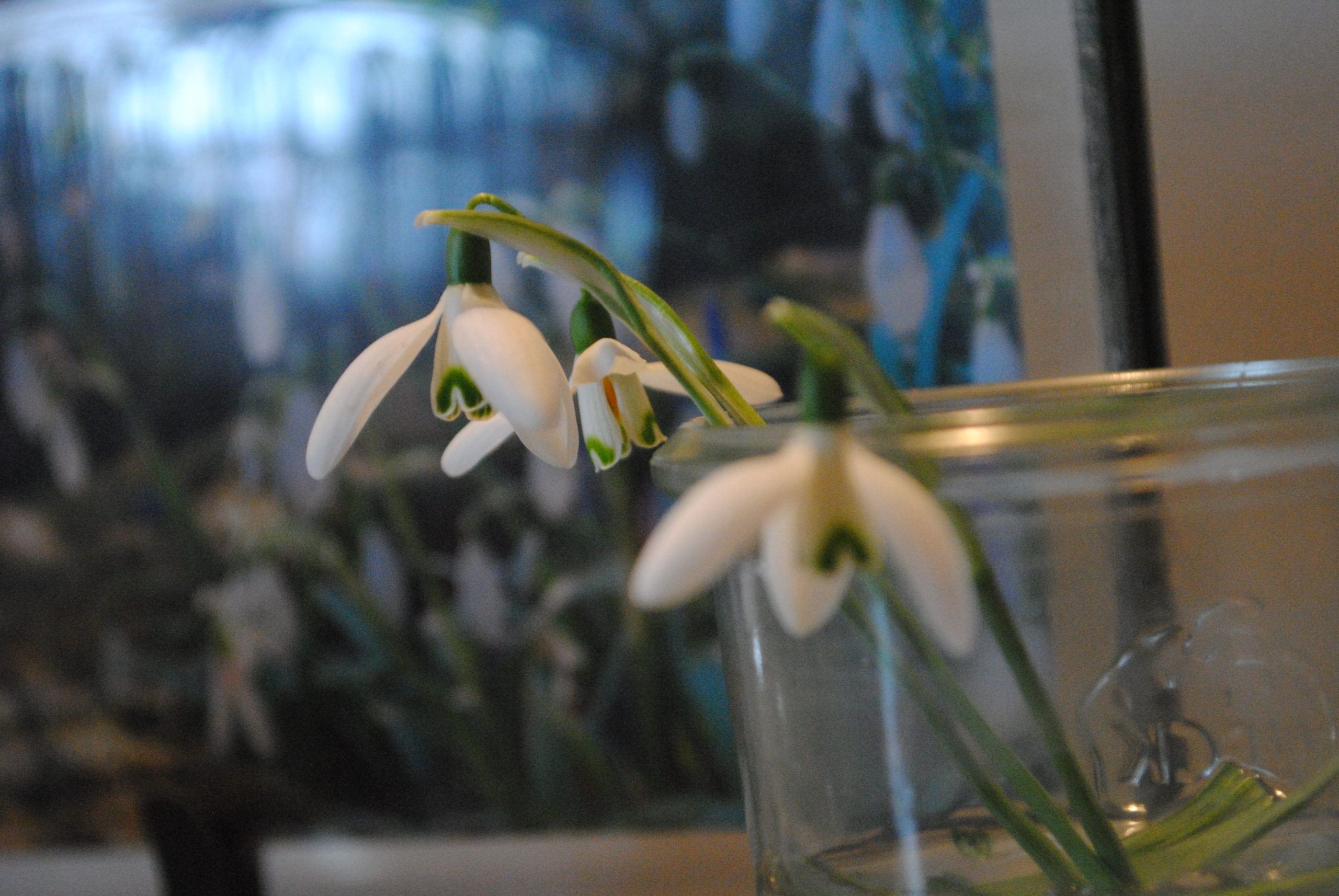 Ich nehme zwei Blüten mit für eine kleine Vase, die neben dem Bild von Schneeglöckchen steht, jahreszeitlich passend, in unserer kleinen Küche.
