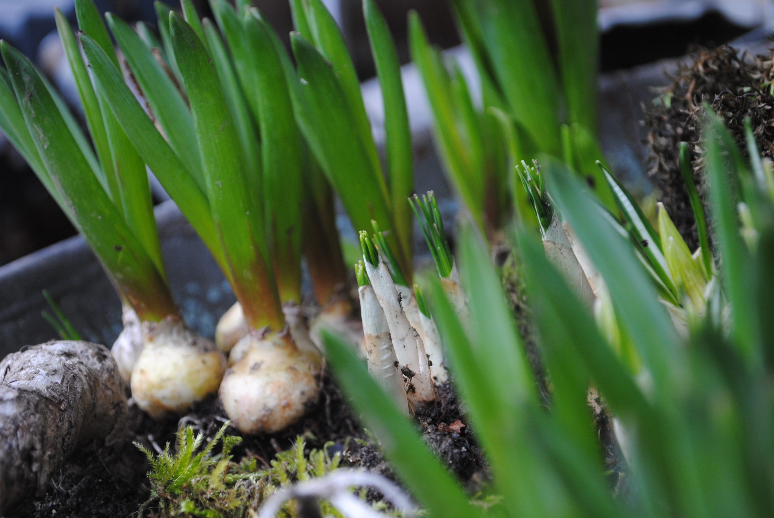 Daneben winzige Blättchen, die sich der Morgensonne entgegen zu recken scheinen, und die unverkennbar aus den Körnern des Vogelhauses darüber, die zu Boden fielen, entstanden sind.